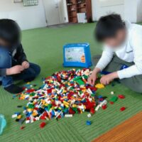 数字やアルファベットのプレートを繋げる紐通しをしました。紐を通しながら「あれ?反対や!」と考え始める子どもたち。数字の順番と表裏を考えながら、真剣に通していく姿がありましたよ。靴紐に見立ててチャレンジする紐通しもしました。上から、下から、右から、左からと紐を通す順番をじっくり考えながら通していきます。靴紐と同じように蝶々結びにも挑戦しましたよ。「輪っかを作って…、できた!」何度か挑戦してできるようになると嬉しくて、繰り返しチャレンジし、「靴の紐もできるかも!」と前向きな子どもたちです。一つひとつ出来る事が増えていくと嬉しいですね。