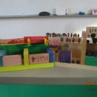段ボールに紙コップを敷き詰めてピンポン玉を3個投げ入れ、合計の点数を計算するゲームで計算力をつける活動をしました。数字2つの足し算は数が大きくてもずいぶん計算出来るようになってきた子ども達ですが、3つの計算は頭を悩ませます。1年生の子が計算に困っていると上級生が助ける事も自然にできるようになりました。