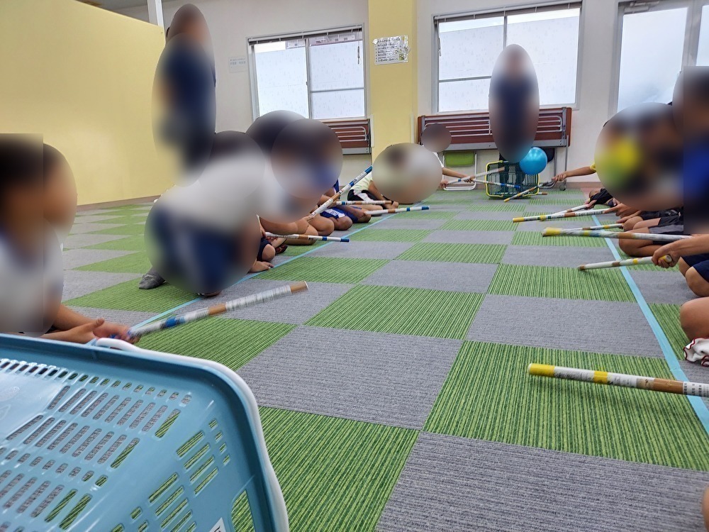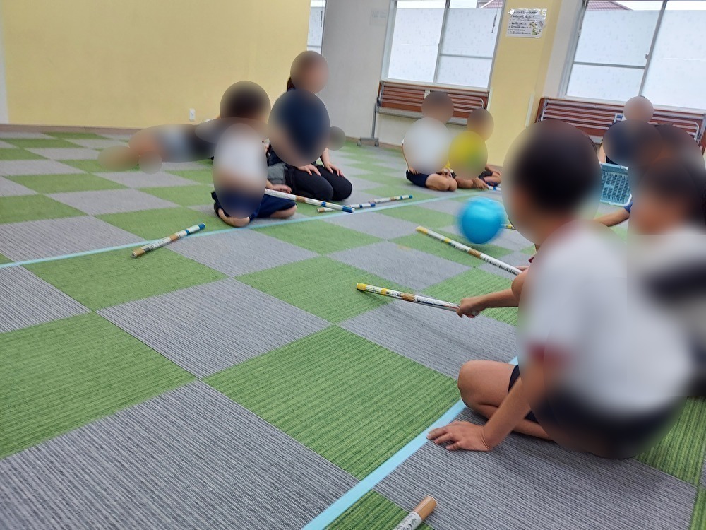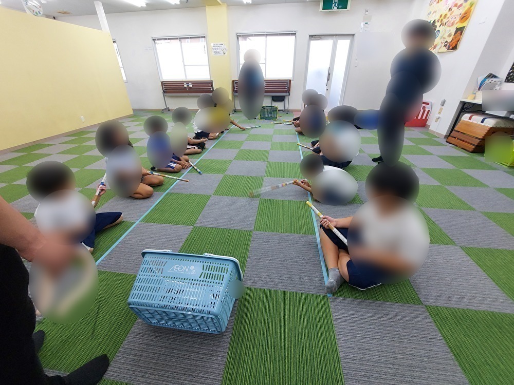 新聞紙の棒を使い、棒サッカーを行いました。黄色チームと青色チームに分かれて点数が入ると座っている位置を変えていき、線の中に入ったり、お尻を上げたりすると1回休みのルールにしました。子どもたちは「早くやりたーい!」とやる気満々の様子でした。ゴールに近い子はキーパーのように守ろうとする子やボールを止めようとして、必死に手を動かしてお尻を上げてしまいたくさんの休みがでることもありました。ゴールが決まると席を移動している間に気持ちが切り替わり、ゴールにボールを入れようと諦めずに最後まで集中して大変盛り上がりました。