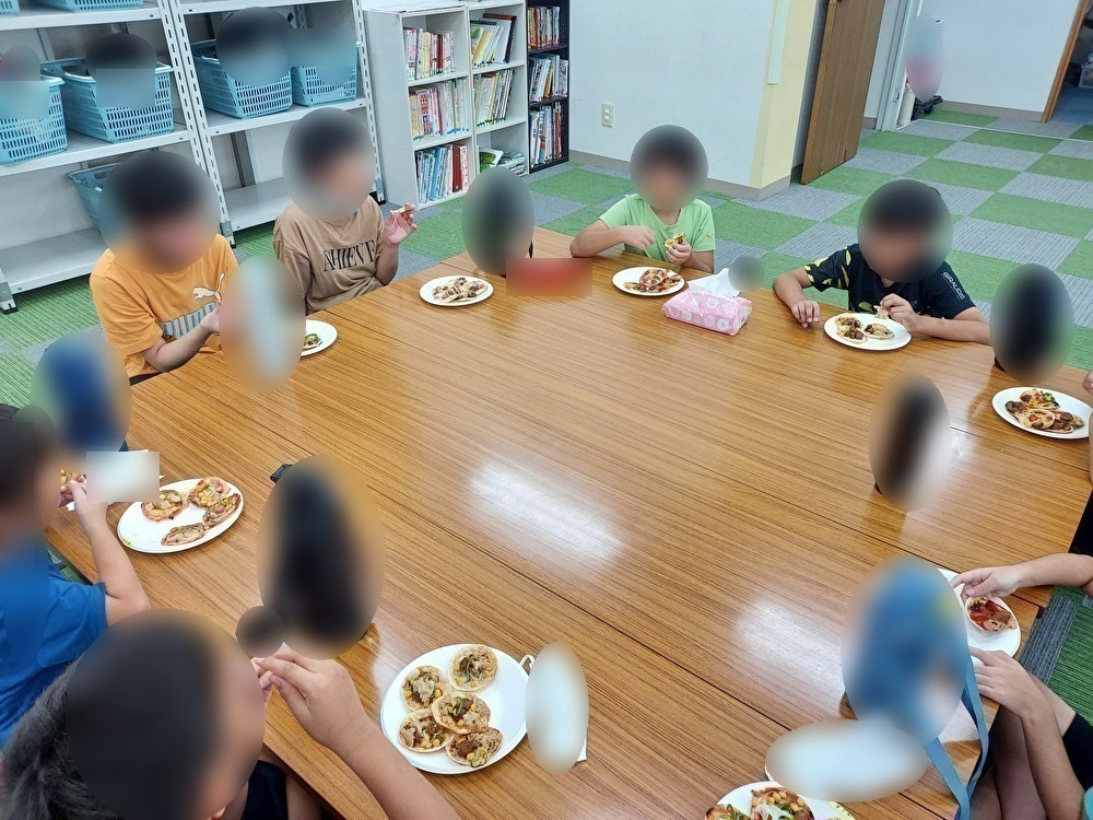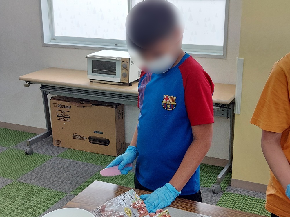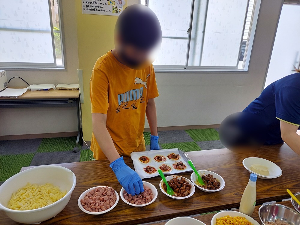 子どもたちが楽しみにしていた調理実習をしました。低学年の子はピザに使う材料を袋から出していき、トッピングをしやすいようにボウルにケチャップやチーズなどを入れていきました。高学年の子にはミートボールをハサミで細かく切ったり、ソーセージを子ども用の包丁で輪切りに切ったりしていきました。ピザに使う材料が揃うと餃子の皮に自分の好きな具を並べていきました。「どれにしようかな・・」と考えながらスターの子はミートボールが1番人気でした。ホットプレートで焼いていき、おいしそうな匂いがしてくると「お腹減ったー!」とワクワクしていました。子どもたちみんなで「いただきまーす」をしておいしそうに食べていました。職員が作ったおかわり用の野菜いっぱいピザも喜んで食べていました。食べる子は20枚近く食べて、大満足の子どもたちでした。