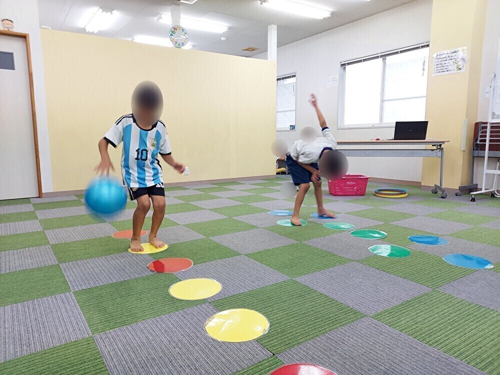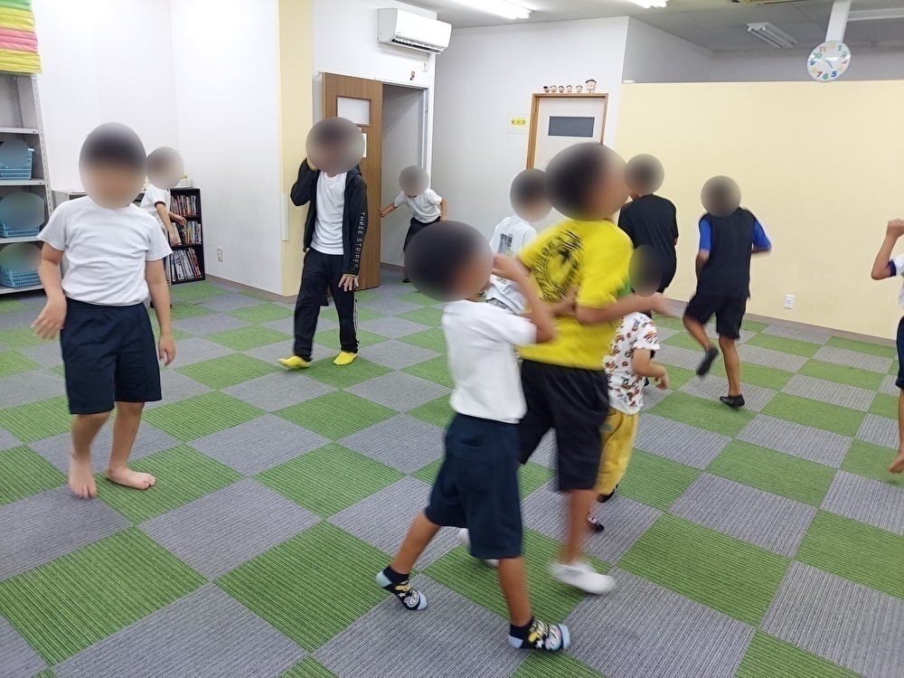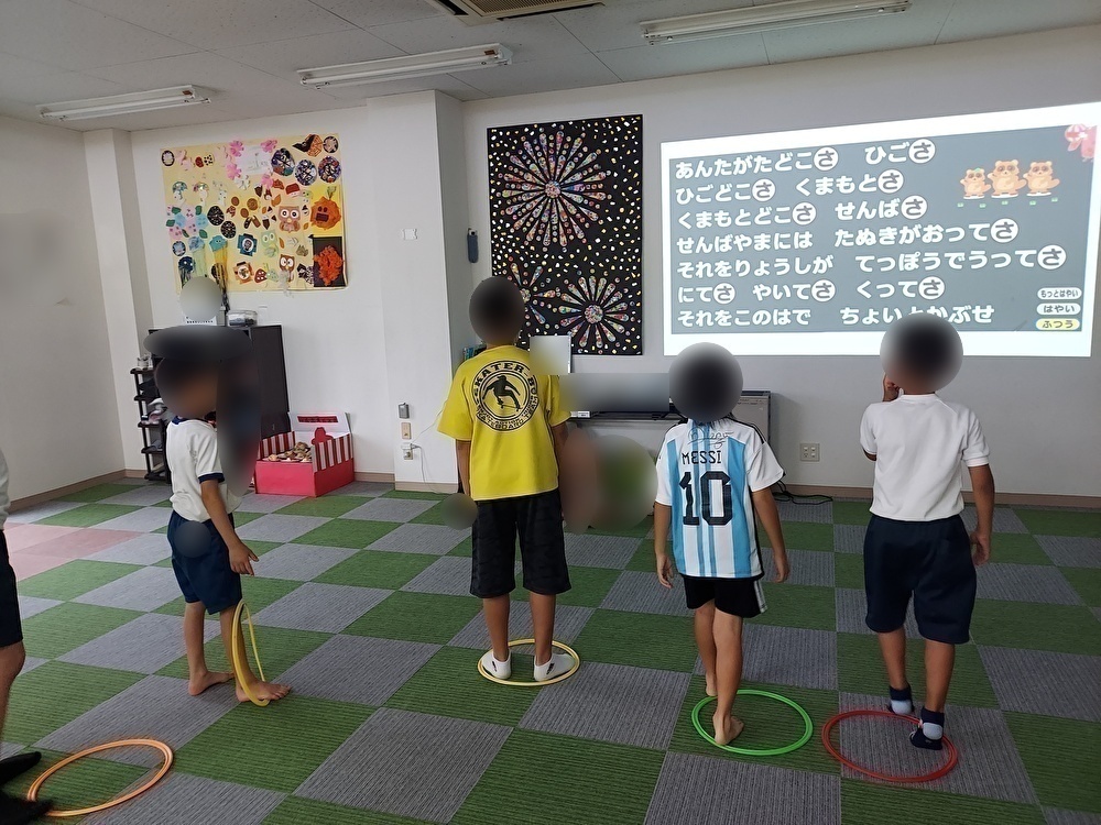 音を聞きリズムをとりながら体を動かしました。メトロノームのタイミングで音を聞きながらケンケンパをしました。はじめはタイミングがわからず苦戦をしていましたが、少しずつ慣れていきタイミングを合わせながら「簡単やー」とケンケンパをしていました。次にピアノの音を聞きながら止まったり、走ったりと音を覚えて体を動かしました。体を動かすのが大好きな子どもたちは「うわーー」とダンスのようにいろいろな動きをしながら音を聞いて体を動かしていました。音が止まるとおもしろいポーズにこだわる子もいてマネをする子もいました。最後にイントロドンをしました。音を聞きわかった子は手を挙げて答えていきました。はじめは答えたい気持ちが強く手を挙げる前に答えていきましたが、ルールを理解して元気よく手を挙げて答えていましたよ。