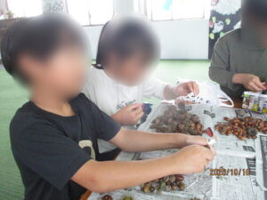 帰ってから、みんなでどんぐりを綺麗に拭きました。このどんぐりを使い、来月どんぐり制作を楽しみたいと思います。