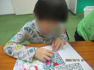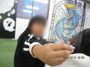 今回、ステンドグラス風シール塗り絵に挑戦しました。イルカの模様・お花の模様から自分の好きな模様を選びました。図案を見ながら、番号と同じ場所のシールをはがし、シートに貼っていきます。細かいシールということもあり、剝がしにくいかと思いましたが、子ども達は一人で根気よく貼り進めていましたよ。「私、細かい作業好きなんだー。」「僕シール貼り苦手なんだよ。」と話しながら取り組んでいました。ずれたらシールを貼り直したり、丁寧に最後まで集中して貼る姿が見られました。出来上がると、電気の光に当ててみたりと嬉しそうに指導員にも見せてくれました✨