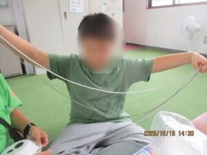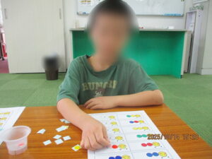 初めに、イモムシのシール貼りをしました。色を言ってみたり、指差しをして、色を教えてくれる姿がありました。シールをはがし、摘まむと指にくっつき、思うように貼れず、難しい様子もありました。でも、指導員と一緒にイモムシの体の色を確認しながら、よく見て貼っていましたよ😊