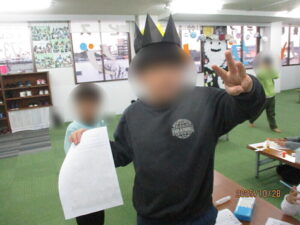 「ビンゴ!」となると、“サプライズ”でハロウィンパーティーでも付けられる王冠などの小物を作りプレゼントしました。子どもたちはさらに目を丸くして熱くなっていましたよ!この盛り上がりをきっとハロウィンパーティーでも発揮してくれると思いました。