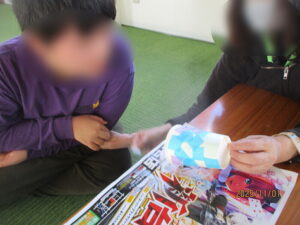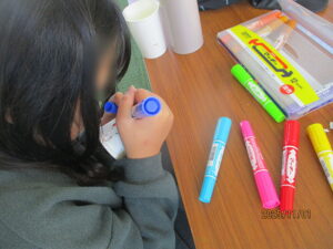 その後からは紙コップを使い自由に制作をしました。輪ゴムを飛ばしたいとおもちゃを作っていたり、紙コップに絵を描きカッターナイフで切り抜きもう一つの紙コップを重ねてぐるぐる回して遊んだり、ロケットを作って発射させて遊んでいました。紙コップランタンをもう一つ作っている子もいましたよ!