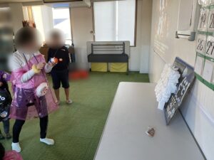ハンバーガー(クッション)運びもしました。頑張って早く走ろうと奮闘する姿が見られましたよ!そして「シューティングゲーム」です。紙コップと風船を使いスーパーボールを飛ばして命中した場所のお菓子がGETできます。子どもたちは上手に当ててお菓子をGETしていました!
