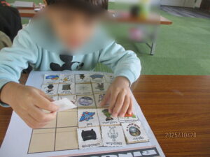 そして皆でハロウィンBINGO大会をしました。BINGO台紙にハロウィンイラストをそれぞれ好きな場所に貼る子、中には少しでも英単語を書いてみようと頑張っている子もいました。自分の名前をローマ字で書いて見せてくれる子もいましたよ!順番にBINGOのくじを引き、発音出来る子には発表してもらいながらBINGOを進めました。「リーチ、リーチ…ダブルリーチ!トリプルリーチ!」と声が上がりました。