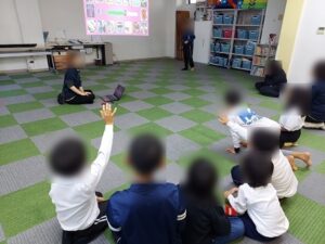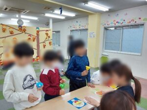 次はハンドベルの練習です。これまでも何度か触れたことがあるので鳴らすのも上手になってきました。自分の担当の音になるとベルを振って鳴らすのですが慌ててしまってなかなかテンポが合いません・・・周りの子の音をよく聞くこと、指導員の手拍子を見ることを意識して取り組んでもらいました。最初は息が合わなくても少しずつ波長が合うようになってきたと思います。活動が終わってもずっと歌が頭から離れなかったのかみんなクリスマスソングを口ずさんでいて待ち遠しい気持ちが伝わっていきました。