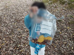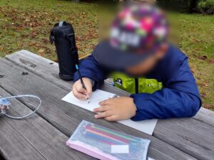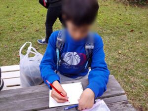 四日市にある垂坂公園へ行きスケッチと公園遊びをしていきました。少しずつ色づく葉っぱやたくさんのどんぐりに秋を感じることができました。公園を一周回るうちに自分の描きたいものを見つけよう!と、みんなで山の中を探索。どんぐりや木の実、色の付いた葉っぱ、きのこなど宝の山です。「これもいいし、こっちもいいなー」と書きたいものがたくさんありすぎて困るほど多くの自然に触れることができました。