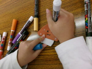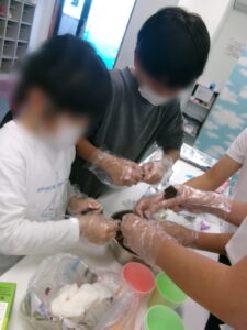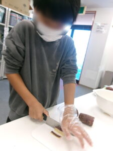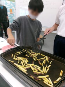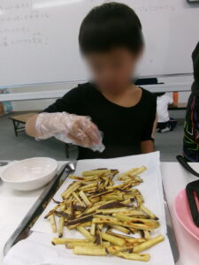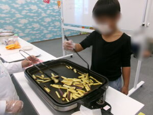 秋の実りと言えば…代表的なもののひとつとしてサツマイモが挙げられますね。そこでサツマイモスティックに挑戦しました。サツマイモスティックだけでは物足りない子ども達のためにホットミルクチョコ・マシュマロトッピングも添えました。しょっぱいものと甘いものの組み合わせは最強の組み合わせ(#^.^#)メニューを公表すると子ども達の目も輝きました。最初にサツマイモをスティック状にカットしていきます。普段切っている食材よりも固いのでレンジで柔らかくしてからカットしました。それでも固いのがサツマイモ。誤って手を切ってしまわないよう慎重に進めていきました。カットしたサツマイモを水にさらし、水分を取って、ホットプレートで炒めていきました。「きつね色」を意識して試食、もっとカリっとした食感を楽しみたければ少し焦げ目がつくまで火を通します。「あ、うまい」まずはサツマイモ本来の味を覚えてもらいました。そして仕上げに塩を振りかけて完成です。ホットミルクチョコ・マシュマロトッピングは牛乳を温めている間に板チョコを砕いてもらいました。「僕もやりたい」「みんなでしよ」協力して進めていきました。そして、お待ちかねの「いただきま~す!」自分たちで調理したおやつに「え、うまいやん!」「これココアみたい」サツマイモとホットミルクの双方が好評でした。後半は味変もしてみようとサツマイモにはちみつやチョコレートシロップなどのトッピングを楽しみました。それぞれの好みの味に変身したおやつはまた子ども達の食欲をそそりました。