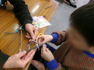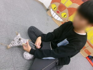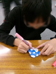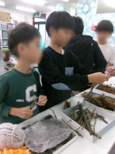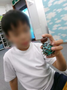 先月の活動で集めてきたドングリや落ち葉などを使用して制作を行いました。この日集まった木の実はドングリ、落ち葉、栗、ソヨゴです。これらを使用して自由制作をしました。見本をいくつか用意しておき子ども達にもイメージが湧きやすいようにして説明していきました。説明を聞いていく中で子ども達もイメージが湧いてきたようでさっそく制作にも取り掛かってくれました。「お、これいいやん」「この木は折ってもいいの?」たくさんの素材を前に子ども達の目も輝きます。平面の飾りだった見本をヒントにして立体的に仕上げたいと言い、指導員に手助けを求める子もいました。作業が始まるとみんな黙々と取り組んでいきます。制作にスイッチが入ったときの子ども達の集中力と発想力は素晴らしいです。指導員が思いもしなかったような作品を手掛けてくれました。自由制作ということで子ども達も自分が作りたいものを自分なりの表現で形にできたので満足してくれました。秋を感じられる素敵な作品、おうちの人にも見せて褒めてもらった子もいてやりがいのある活動となりました。