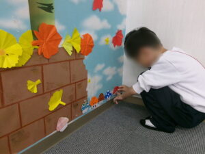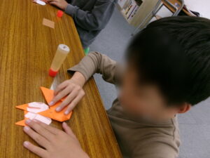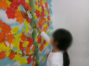 11月11日は折り紙の日です。折り紙の日にちなんで折り紙の活動を取り入れました。今回挑戦するのはキノコとリスです。キノコは簡単、リスはやや難易度が高くなります。最初はキノコから折りました。動画を見ながら指導員の説明も加えていきます。みんなで足並みを揃えてひとつひとつの工程を丁寧に進めていきました。折り紙が得意な子は途中から完成のイメージが湧いたようでさすがだなという印象を受けました。リスはやや難易度が高いために折り紙が得意な子も「あれ、ちょっと待って。これでいいの?」と戸惑う場面も…。それでも後半は「あー、もうわかった」とイメージが湧いたようです。得意じゃない子も途中でめげることなく最後まできちんと折ることができました。キノコやリスに顔を描いたら完成です。みんなそれぞれの個性を発揮して可愛らしい顔、凛々しい顔など描いてくれました。「わ~、いいやん!じょうず~」褒められることでさらに意欲も増します。出来上がったキノコやリスはハグハグの木に付けたしました。ハグハグの木にさらに秋が深まった、そんな素晴らしい風景が完成しました(=^・^=)