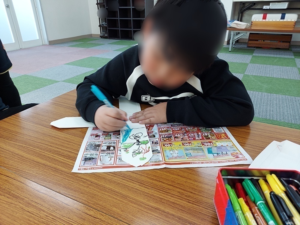 いろいろな素材でベイブレードを作って遊びました。1つめのベイブレードは折り紙3枚を使って動画を見ながら作っていきました。作る工程が多いですが、集中をしながら折っていきました。次に2つめのベイブレードは牛乳パックを好きな形に切り、「なんの絵を描こうかな」と好きな絵を描きました。大きなベイブレードが完成しましたよ。最後に3つめのベイブレードはペットボトルとキャップでトリガーとコマを簡単に作りました。3つのベイブレードができあがると1つめのベイブレードから順にみんなで一斉に回して対戦をしました。牛乳パックは切り方によって大きさや重さが変わってくるため、大きいと弾きやすいですが、小さいと長く回っていました。ペットボトルのベイブレードは箸に糸を巻き付けるのに子どもたちは苦戦をしたり、うまく回らなかったりしましたが、何度か練習をするとうまく回るようになり、「ゴー――シューート」とどれだけ長い時間回るのか一斉に回して競争をして大盛り上がりでした。