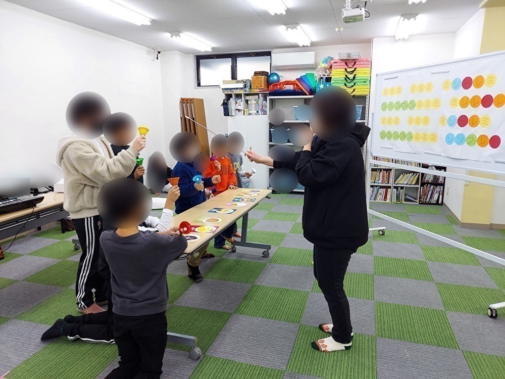 子どもたちの大好きなハンドベルを使ってクリスマスソングを練習しました。はじめに指揮をしてもらいながら『ジングルベル』をしました。子どもたちは音を聞き自分の番になると音を鳴らして「楽しい」、「早くやりたい!」と演奏をしました。何度も練習をするとタイミングがわかってきてスムーズに鳴らしていました。次に『もろびとこぞりて』に挑戦をしました。リズムが違うため、戸惑いながらも何度か練習をして少しずつ成長をしながら鳴らしていましたよ。