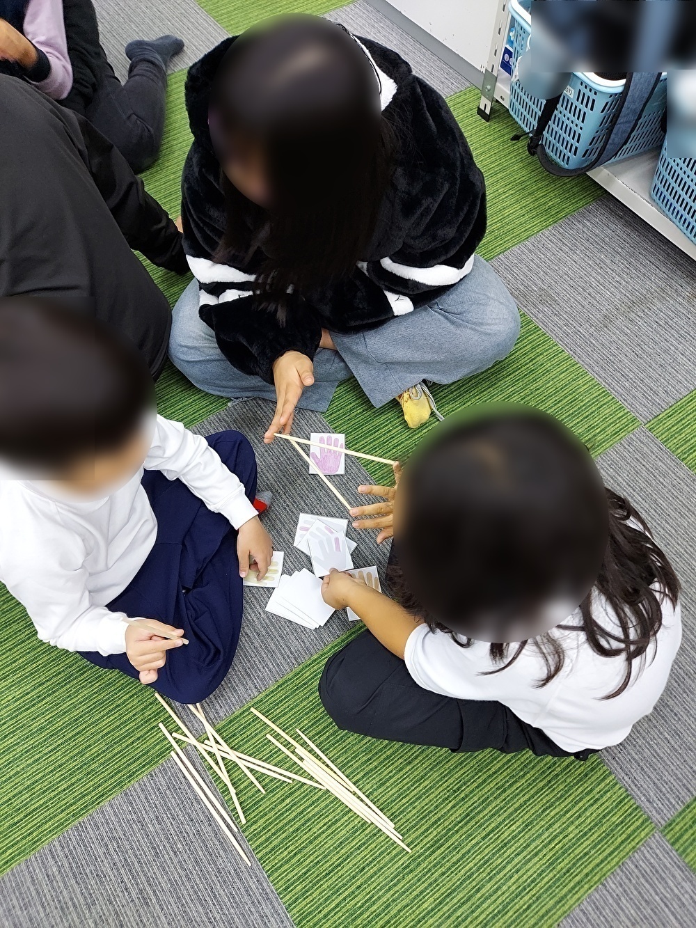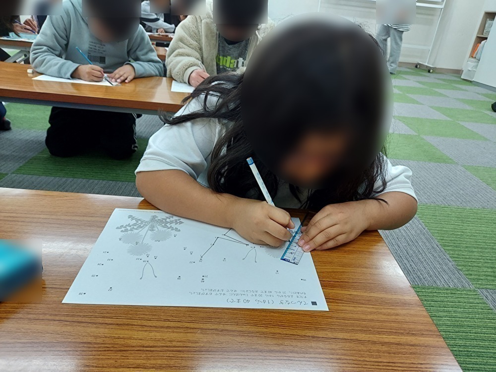 いろいろな絵の点つなぎをしました。低学年の子は点が40までのプリントで3年生からは点が200までのプリントから「これにしようかな・・」、「難しいのがいい」と選んではじめていきました。定規を使うため、慎重に線をひく子や慣れている子はどんどん線を書いていき、すぐに終わらしていました。点が500や1000のプリントにも挑戦して1時間くらいしていました。次に指同士を棒で繋いでいく協力ゲーム『ユビボー』をしました。初めてするためルールを説明してゲームをしていきました。棒を落とさないようにするため、棒を少し強く押す子や力加減を考えながら協力していました。楽しくなり「もっとしたい!」と何度も挑戦してたくさん棒を繋げていました。