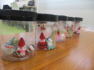 作った飾りを丸い入れ物に入れてスノードーム風の置物を作ることができました。同じような材料や細かい飾りを使っていても入れる飾りや並べ方が違うだけでそれぞれ違ったスノードームが作れました☃️