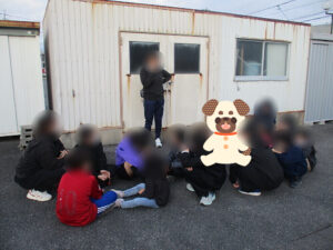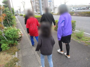 インフィニティは火災が起きた時に飯野公民館に避難することになっているので飯野公民館へ歩いていきました。往復で20分程度歩きましたが帰ってくるとみんなとても疲れていました。話の中で、もし津波が来たらもっと速く走って逃げないといけないよと話をされると「え...」という表情をしていました。