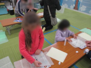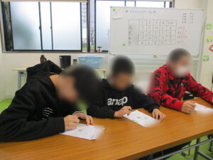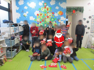 昼食はナポリタンとクラムチャウダーでした🍝今回も、指導員と高校生のお兄さんの2人で美味しいご飯を作ってくれました✨ナポリタンもクラムチャウダーもあっという間に食べ終え、おかわりをする子もたくさん!お腹いっぱいになった中で、お腹休めとしてピアノの演奏発表会を行いました。毎日ピアノの練習に一生懸命で、上手に弾けていた子も本番になると少し緊張したようです😊素敵な演奏を聴いてから、ボッチャを行いました。4チームに分かれて1人3投のボールを転がします。ジャックボールという指導員が置いた白いボールに近づけることが出来たチームから点数が加算されます。投げる前からどのくらいの強さで投げると良いかをシュミレーションしていた子もいましたよ。同じチームの子がうまく近付けることができたら「やった!すごい!」と声をかけていて、大盛り上がりの活動となりました❤高校生のお兄さんは「こんなん簡単!」と言っていましたが、力加減が難しく、ジャックボールに近づけることが中々できず、終わりのころには「難しいって~」と嘆いていました🤭ボッチャの後は、クリスマスBINGOを行いました。今回は、ハロウィンパーティーと同じ、英語BINGOのクリスマスバージョンを作りました。ハロウィンパーティーは平日で、時間も短かったため3×3の9マスにイラストと英語を描いてもらいましたが、今回は、5×5マスの25マスと盛りだくさん!!指導員が描いたクリスマスに関する40個のイラストの中から好きなイラストを選んでマスに描いてもらいました🖌️BINGOが始まると英語で読み上げられるため、「どれ?💦」「これはわかる!」とBINGOを楽しみつつ英語の学習もできましたよ🔤BINGOになった人からプレゼントが選べます🎁可愛いラッピングペーパーの中身はみんなの大好きなお菓子です🍪指導員がお菓子を選んで、クリスマス柄のラッピングペーパーで1つずつきれいに包んだのですが、早く中身を見たい子ども達はそんなことも知らずビリビリに…笑😱 それでもうれしそうにお菓子を眺める姿が見られて良かったです。おやつまでに少し時間があったため、みんなでじゃんけん大会をすることに!勝った人から追加のお菓子と指導員の手作りラブブミラーとラブブクリップをもらうことが出来ます🐰心理戦も行い、「パー出すよ~」と指導員が言うと。純粋な子ども達は指導員の言葉を信じ切ってグーを出してしまい、唖然としていました😵無事みんなじゃんけんで勝って景品をもらうことが出来ていましたよ!そして、指導員が縫ってくれて、自分達でデザインしたクリスマスブーツにもプレゼントが!ノートとペンをもらうことが出来、大喜びでした❤その後、もらったブーツを持って記念に1枚📸