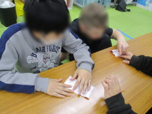 去年に引き続き、今年もしめ縄作りをみんなで行いました。準備として、別の日や当日の午前中を使ってお花紙4枚をのりでつなげたものを4セット2色ずつ作っていきました。紙が薄いので、のりをつけすぎると破れてしまうこともあって苦戦している子もいました💦早く終わった子は終わっていない子の手伝いもしてくれていてとても助かりました。花紙をつなぎ終えたら次は、飾り作りです。折り紙を使って扇や葉っぱ、椿の花を作りました。扇は、蛇腹折にしてホッチキスで下の部分を止め、指導員が準備していた画用紙の水引をテープでくっつけます。葉っぱは2枚作りました。側面に細かく切り込みを入れるのですが、途中で止まらずつい切り落としてしまう子も…😱椿の花は丸く切った5枚の折り紙を上手く重ね合わせて花にします。中心の黄色の部分は折り紙をクシャクシャにして一度広げ、白い部分が見えないように丸めて中心に貼って完成です!この作業が1番きれいにできている子が多かったです✨次に土台を作りました。土台はつなげた花紙を使います。2色それぞれ4つの束をまとめてねじり、1本の縄を2つ作ります。その2つの縄を交互にねじってしめ縄が出来ます。自分で縄を編んでいく子は、締めすぎず、緩すぎず編んでいきました。土台と飾りが完成したら、最後は指導員がグルーガンですべての飾りを引っ付けて完成です🌟今回の活動は、ハサミやのりを使う細かい作業が多く、難しかったようですが、一生懸命頑張っていました!もっともっとハサミやのりを上手く使うことができるよう、いろんな制作活動を今後取り入れていきたいなと感じました。