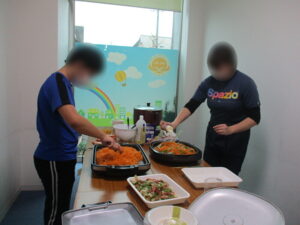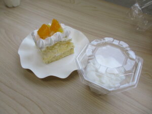 最後にみんなでおやつを食べました。デザートは指導員の手作りのケーキとカップに入ったパンナコッタかキャラメルプリンです。ケーキは、クリームとフルーツがたっぷりで口いっぱいに頬張っていましたよ😋