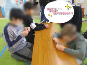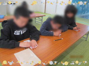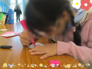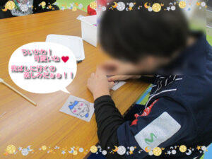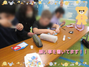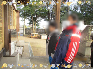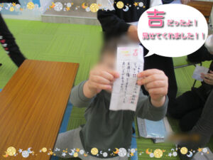 神社に行く前に、今年はみんなで手作りのおみくじ作りをしていきました。おみくじを作るにあたり、もらった人が、嫌な気持ちにならないような前向きな内容にして欲しいことを伝え、各々作っていきました。おみくじを引くことはあっても、なかなか作る機会はないので、みんな楽しそうに作り始めていました。みんなが書き終えると、小さく折りたたんで、参拝後に引いていくようにしました。参拝前に手順をみんなで確認し、模擬練習をしてから歩いて行ける神社へ出発していきました。到着すると先にスターの子どもたちや指導員さんがいて、「明けましておめでとう」と挨拶を交わしました!!鳥居をくぐるさいに一礼して、真ん中を通らないよう端を歩いていきます。お賽銭を入れて、願い事を心の中でお願いして、帰ってきました。少し寒かったのですが、みんな交通ルールをきちんと守り、他の人の邪魔にならないよう歩いてくれていました。