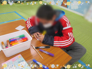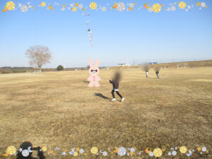今日は、凧揚げ作りをしました。1月が始まって1週間、神社に参拝に行ったり、すごろく作りをしたり、絵馬を作ったりお正月でする事を活動の中でしていきましたがいよいよラストの凧作りです。毎年、凧作りをしていますが、今回は、室内で使える凧と屋外で使う凧の2種類を制作しました。午前中は、ミニ凧作りから始めました。とっても簡単なのでみんなやる気満々でした。凧の部分は食器棚シートを使いました。8㎝×10㎝の大きさにして、各々好きなイラストを描いていきます。自分で描く子、ぬりえを写す子と様々でした。油性ペンで色付けしてくれました。その後、スズランテープを40㎝に切り、2つに割いていき、テープで止めました。あと凧紐をつけて完成です。午後からは2チームに分けて、制作していきました。THE凧!!を作るチームは動画で検索をして、見ながら作っていました。材料をあらかじめ揃えておいたので、自分で選んで作りあげていました。もう1つは、バードカイトという凧を作りました。画用紙を使い、鳥の形に作っていきます。こちらは、簡単なので多くの子が作っていました。この日は、天気も良く、暖かかったのもあり、河川敷に行きました。最初は凧揚げをして、走り回っていました。遊び道具も持っていったので、後半はボールなので遊んで1時間満喫して帰ってきました。