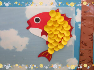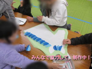 この日は、絵馬作りと壁面飾りをたくさん制作していきました。最初に、絵馬作りからしていきました。折り紙を使って、ダルマを作っていきます。絵馬は画用紙を使い、好きな色を選び、作ったダルマや花などの飾りを貼っていきました。その後、今年、叶えたいことや願い事を書いていきますが、みんなどうしようか悩んでいました。その後、今年の干支である馬を制作していきました。馬は、丸く切った水色と青の画用紙を半分に折り、鬣に見立てて貼っていきました。触ると気持ちよくて、みんな触って楽しんでいました。もう1つは、めでたい(鯛)を作っていきます。こちらも黄色の画用紙を丸く切っていくのですが、その丸に切り込みを入れて、少し立体にして鱗を表現していきました。こちらは、高学年の子たちに手伝ってもらい、進めていきました。みんなのセンスで鱗をバランスよく貼ってもらいました。出来上がると華やかになりました!!その後、馬の飾りも作りました。個性ある作品となり、冬の殺風景な壁面が明るい印象になりました!!