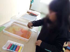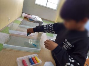 1月の飾りはだるまと凧揚げにしました。まず、凧の形に切った画用紙にマーブリングで模様を付けました。水に浮かべた絵具の模様が画用紙にきれいに転写されると目をキラキラさせて『できた!』と嬉しそうに教えてくれました。
