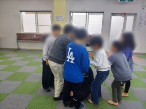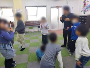 そのあとは全員で『あぶくだった にえだった』という伝承遊びを行いました。初めてするのでしっかりと指導員の話を聞きルールを学びました。『おばけのおとー』という合図で逃げ、つかまってはいけないルールです。初めてする遊びだったので最初はなかなかうまくできませんでしたが、少しずつ遊びが成立し最後は大盛り上がりでした。次はもっと盛り上がるように外でやりたいと思います。