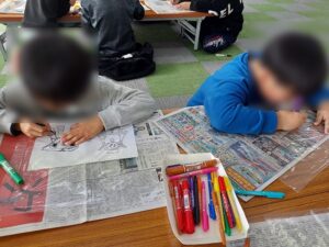 みんなで凧を手作りし、凧あげをしました。正方形に切ったビニールに好きな絵を描き、両端に竹ひごをつけます。絵を描くのが好きなスターの子供たち。一生懸命好きなキャラクターを描いていきました。描きたい絵にこだわりすぎて時間が無くなってしまったので、時間のことも気にしながらできるとよかったねと学ぶことができました。竹ひごやしっぽをバランスよく貼りつけ完成です。