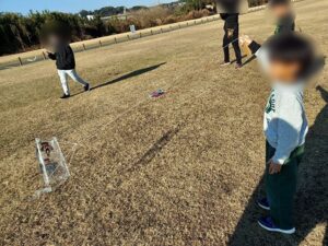 出来上がった凧を持って河川敷の広場へ行きました。お天気が良すぎて風がほとんど吹いてなかったので、走るしかありません。お友達とぶつからないように気を付けながら全力で走りました。弱い風でしたが上手に風を捉え、凧揚げをしているお友達もいました。その姿を見て、自分もやってみたいと挑戦する子もいました。お友達の影響は大きく何度もチャレンジしていましたよ!