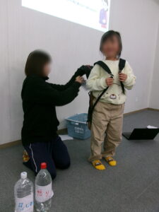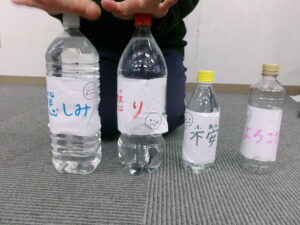 最後はペットボトルを使って気持ちを溜め込むことの辛さを実感してもらう例えを体験してもらいました。「嬉しい」は500の空のペットボトル、「不安」は500の水入り、「悲しい」「怒り」は2ℓの水入り。これをリュックに背負ってひとつずつ入れていったり減らしていったりしました。どの感情が特に重たく感じるのか、それを取り除いたときにどれくらい軽くなるのか、子ども達も「あ、重い」「軽くなった」と実感してくれました。ではどのように感情を吐き出せばいいのか、その対処法までをみんなで学びました。