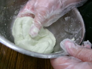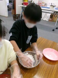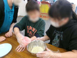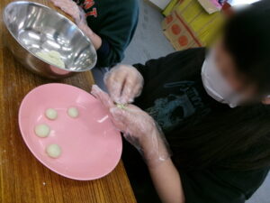 この時期のおやつと言えば…白玉ぜんざいが代表的ですよね。スカイでも白玉ぜんざいを作ってみました。メニューは通常の白玉ぜんざいに加えて白玉の中にチョコを入れたり、抹茶パウダーを混ぜたり、お団子にきな粉や抹茶パウダーをまぶしたりと盛りだくさんでした。子ども達は自分好みの味や見た目にこだわって作っていきました。特に中にチョコを入れたり抹茶パウダーを混ぜたりするのが人気でした。「水は少しずつ足していく」「お団子は耳たぶくらいの固さだよ」というポイントに注意しながら進めていきました。「こんくらい?」と指導員に確認しながらこねていく子もいました。途中水の量が多すぎて形にならない団子になってしまった子も…。応急処置として片栗粉で固さを戻すことにトライしました。それをフォローしてくれる子もいたおかげで見事に復活!いい感じの固さに戻りました。子ども達も率先して動いてくれました。ゆで時間が回ってくるまでの空き時間に洗い物をしたり、床に落ちてしまった粉を掃除してくれたり、そんな姿に子ども達の成長も感じられました。