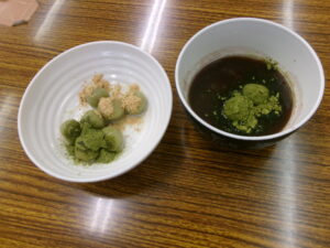 ゆであがったお団子はお椀とお皿に分けました。お椀はぜんざいに、お皿のお団子はパウダーで味付けしました。抹茶パウダーは砂糖が入っている物と入っていないものとあり、その2種類をブレンドしていい味になるよう子ども達が調整しました。「抹茶の味が濃すぎる」「もうちょっと甘くしよ」「甘すぎる」「これくらいでちょうどいいんじゃない?」いろいろと試行錯誤しながら「これうまい!」というパウダーが完成しました。
