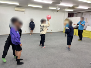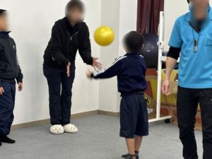 この日はボール遊びの基礎から体験して、最後に集団遊びへと繋げていく活動としました。まずはウォーミングアップ。みんなで輪になってボール回しから進めていきました。慣れてきたらボールの数が増えてくる、ボールを顔の上の高さまで上げてパス、といったような感じで変化もつけていきました。最初はボールの落下もなく余裕な感じを見せていた子ども達でしたがボールが増えたことやボールを上げるといった行動が加わったことで落下が目立つようになってきました。目で追う、指先や手首の使い方などその子その子に合わせたアドバイスも加えていきました。アドバイスをもらうことで子ども達も意識してくれてだんだんとうまくできるようになっていきます。次にカラーボールを使っての個人での取り組み、ペアでの取り組みと繋げていきました。ボールを真上に上げて手を叩くという取り組みの中ではカラーボールをふたつ同時に上げて3回手を叩くことができたという強者も…!それぞれの力に合わせて少し頑張ってみようとみんながチャレンジ姿勢で取り組んでくれていました。この日特に熱戦だったのがペアでのチャッチボール。1分間で何回チャッチできるかなというお題の中で「もう一回やろ」とチャレンジ精神を見せてくれました。一回目は32回、2回目は40回と回数が増えたことによる達成感も感じてもらえました。