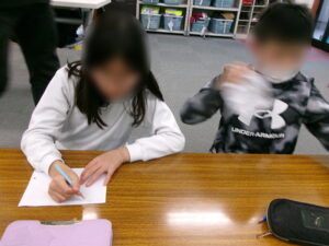 次にスカイの中でよく耳にする発言も例に挙げながら子ども達に考えてもらいました。「大人はいつも文句ばっか」「僕は(私は)なにもできやん」という発言には「あ、おれ言うとる」「それ私やん」と子ども達も自覚しながら反応してくれました。「じゃあ、これをポジティヴな言葉に言い換えたらどうなる?」ここからが大事な所ですよね。子ども達も自分なりの考えを発表してくれました。また、自分が言われても気にしない子もいる中で、自分の大切な人が言われていたらどういう気持ちになるかという客観的視点に立った時に子どもの捉え方も変わってきたようです。「嫌な気持ちになる」という素直な意見も出ました。さらに、子ども達の目の前に紙を配りました。そこに言われて傷つく言葉を書き出してもらいます。その紙をぐちゃぐちゃにしてもらいました。元通りにしわを伸ばして戻そうとしても…戻りませんよね。それが言われた人の心の傷なんだよ、一度言われた言葉は元通りにはならないんだよと発言の大切さも感じてもらいました。