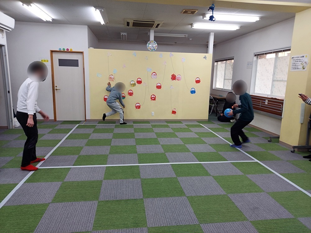 ボールを使っていろいろな遊びをしました。はじめにラジオ体操第一をしました。何度かしているため、覚えている子が多くスムーズにしていました。次に全員で円になって、ボールを投げる・受けるの練習をしました。投げたい気持ちが強くアピールしている子が多くいました。次に二人一組になり、キャッチボールをしました。力加減やコントロールが難しいですがお互いのことを考えながら少しずつ上手になっていました。次にボール鬼ごっこをしました。ボールで当てないといけないのと白い線の上しか移動できないルールで逃げる子は白い線とボールを見ないといけないため、当たらないように一生懸命に逃げていました。ボールを当てる子はボールでしっかりと狙い、当たると大喜びで大変盛り上がりしました。