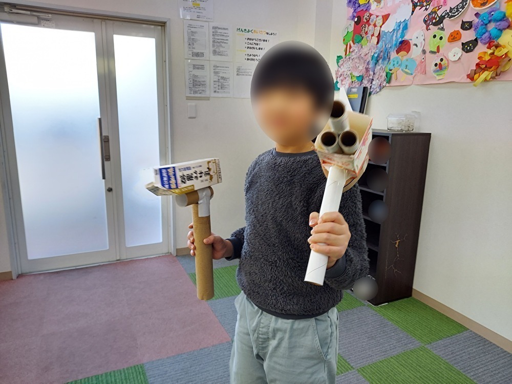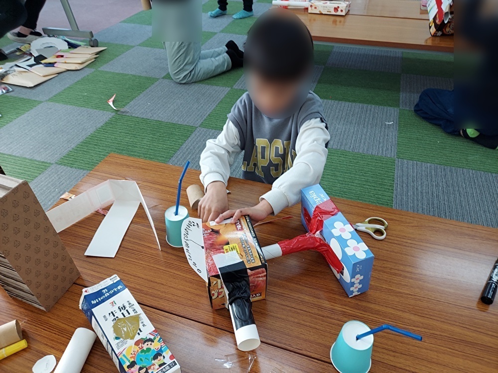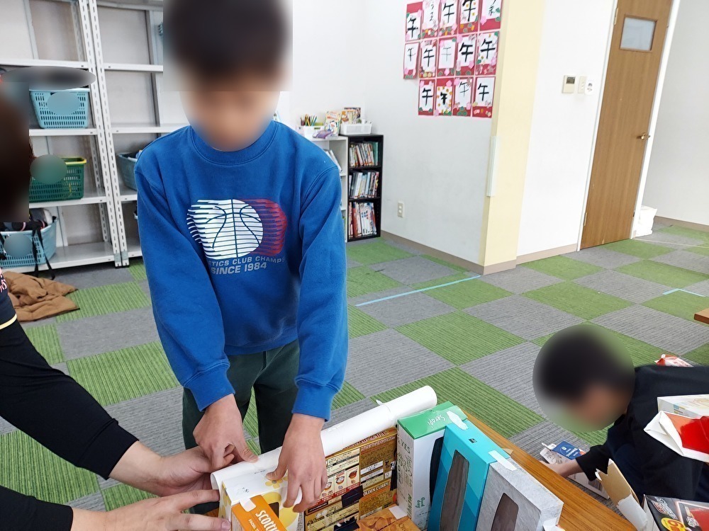 廃材を使っていろいろな物を作りました。牛乳パックや食べ物の箱などをたくさん並べて、子どもたちは宝物を見るように触りながら何があるのか確認をしていました。テープの無駄遣いをしないなどの約束をして使いたい廃材を選んでいきました。車や恐竜など作りたい物が決まっている子はどんどんと組み立てていき、わからない子は指導員と相談をしながら作っていました。作っているとアイデアが広がっていき、はじめに作りたかった物よりも大きくなる子もいました。作り始めると時間はあっという間に過ぎていき、好きな活動ということもあって2時間ずっと制作していました。できあがると「見て見て」と嬉しそうに見せてくれましたよ。