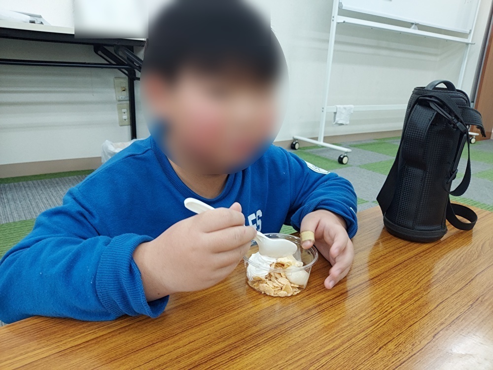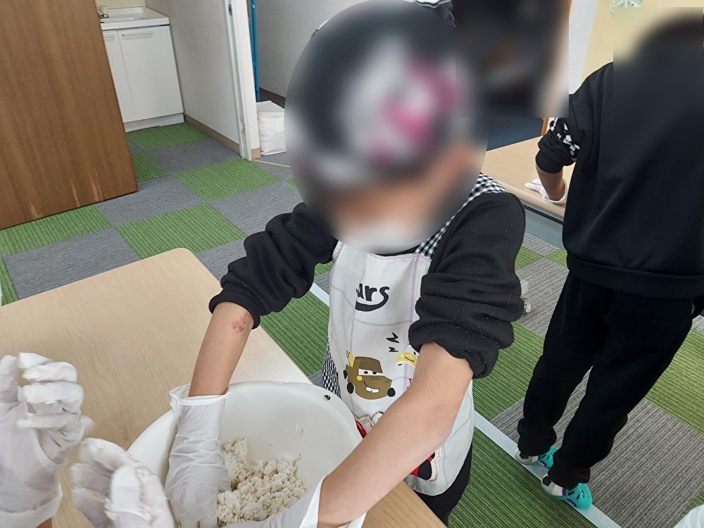 子どもたちが楽しみにしていた白玉ぜんざいを作りました。団子を作るチームとおしるこを作るチームに分かれて作りました。団子を作るチームは白玉粉と豆腐に水を調整しながら順番に交代してこねていきました。むにむにと感触を楽しみながら、できあがった生地を団子の大きさに丸めていきました。子どもたちは集中しながら「このぐらいの大きさかな・・」と丁寧に作っていましたよ。おしるこを作るチームはお玉で混ぜて溶かしていきました。クッキングヒーターを使うため、混ぜない子は近づかないなどルールを確認して混ぜていきました。アイスクリームや生クリーム、きな粉などトッピングを「どれを入れようかな」と悩みながら子どもたちは美味しそうに食べて大満足でした。