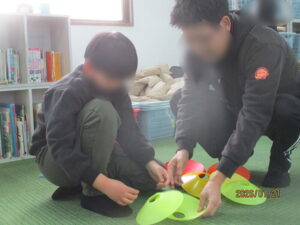 コーディネーショントレーニングをご存知でしょうか。コーディネーショントレーニングとは、一言で表すと「運動神経を高めるためのトレーニング」と言われています。リズム能力だったり、バランス能力だったり、他にも様々な要素が含まれており、全ての要素を鍛えると、コーディネーション能力が高まります。実際、スポーツ選手の育成にも使用されている様です。今回ハグハグではトレーニングとして、マーカーコーンを片足立ちのまま積み上げたり、自分のコーンを守りながら、相手のコーンを取って増やしていく「マーカーコーン集め」、最後にそろりぞろりゲームを行いました。どのトレーニングも大盛り上がりで、楽しみながら運動神経を向上させると共に、活動を通して自然と周りの人とコミュニケーションを深められる場面が沢山ありました。こういった運動の活動は子ども達から人気の1つです☺︎