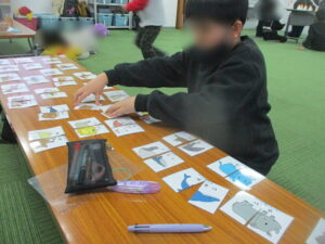 日常生活の中で当たり前のように行動している時間について、改めて学びました。時刻と時間について子ども達に尋ねると、自信満々に答えてくれる高学年の子どもたち。さすがです☆低学年の子はまだ知らない子も多かったので、一緒に考えてみました。タイマーを付けて時間間隔を感じながら、輪になって「しりとり」を行いました。時間の感覚を目視しながらも、いつタイマーが鳴るか分からないので、「もう少しかな?」と声を掛け合いながら、楽しむ姿がありました。次に数字のカードを時計と同じように並べて、ペアを組み、実際に長針と短針になってみました。並べたカードを正面から見る形になるので、なかなか難しく、苦戦する姿も見られましたが、楽しんで取り組んでくれていました。この活動で学んだことを,これからの生活に活かしていって欲しいと思います☺︎