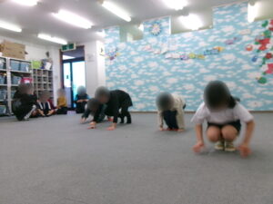 次に、「アニマルウォーク」をしました。クマやウサギの動きを真似するもので、右足と左手・左足と右手を同時に前に出すなど、頭で考えながら体を動かさねばならず、最初はできていても途中から「あれ?分かんない!」と、こんがらがる子がたくさんいました。ゆっくり一つ一つの動きを丁寧に取り組むと、「あぁ!こういうことか!」と理解して正確に体を動かすことが出来る子が増えていきました。