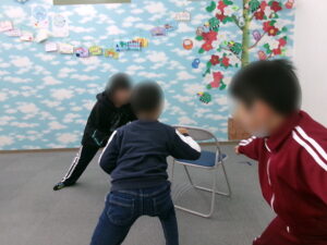 始めにウォーミングアップとして「後出しじゃんけん」を行いました。「じゃんけんポン・ポン」のリズムに合わせて後出しをして勝ったり負けたりする、というシンプルなものでした。「勝つ」ことは容易いですが「負ける」となるとやや難しいようで、「あれ?」と首をかしげる子が何人かいました。何度か繰り返すうちに子ども達の成功率が目に見えて上がっていきました。