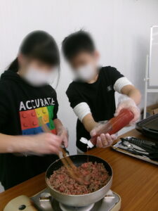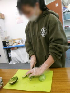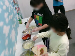 そして調理を開始。今回はメインの具材担当とトッピングの野菜担当にグループを分けて行いました。具材担当の方は王道のサルサソース、カレー風味、和風ソース風味、ウインナーの4品目に挑戦。調味料は目分量で調整していきました。少しずつ味を見ながら調味料を足していきます。「おいしい」「でもなんか味がうすい」「もうちょっと足してもいいんじゃない?」そして「これでええやん!」という味にたどり着きました。トッピング担当の方ではアボカドを始めて触る子もいました。アボカドを半分にカットすると「えっ⁉アボカドってこんなんやったんや」と驚く姿も。慣れない具材も指導員の補助のもとカットしていきます。「猫の手」を意識して慎重に。みじん切りにはブンブンチョッパーを使用することで全員がカットにも挑戦できました。