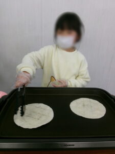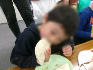 そして自分でトルティーヤを焼いて具材を乗せていきます。最初は2枚作りました。「まずはカレーと普通の」「アボカド挑戦してみるわ」「緑の野菜嫌いやけどこれくらいならいけるかも」子ども達はこの日の目標をきちんと意識してトッピングしてくれました。そしていただきます!子ども達の口からは「おいしい‼」のひと言が出ました。おかわりはこの2枚を食べたうえで自分好みの味やトッピングに挑戦してもらいました。「次は違う味にしてみる」「今度はこれ入れよ」「さっきよりうまい!」「アボカドやっぱ無理…」それぞれが味の変化を楽しめました。「野菜食べれたよ」「たしかに野菜あった方がおいしいな」「アボカドってうまいんや」などそれぞれの感想もいっぱい聞けました。そして余ると思っていた野菜が真っ先になくなるほど野菜が売れました。
