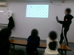 初めに行ったのが、「文字探し」でした。たくさんの文字の中から違う文字を見つける間違い探しのような内容で、徐々に難易度を挙げた計6問を行いました。始めのうちは規則的に並んだひらがなを使った問題でした。「は」の中から「ほ」を探すといった内容で、開始早々「はい見つけたぁ!」と子ども達は口々に叫んでいました。問題を解くごとに文字が漢字やアルファベットになったり並び方が不規則になったり仲間外れの文字数が増えたり減ったりと、難易度が上がっていくにつれて「違う文字、3つ…やんな?」「分からへん!」と、目を凝らしながら奮闘する姿がありました。「見すぎて目痛くなってきた!」と笑いながら目を動かす子もいました。