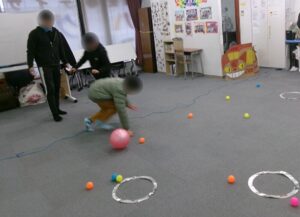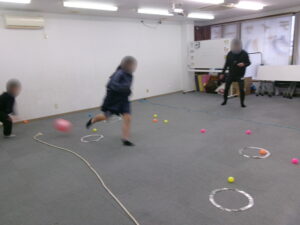次に行ったのが、「ボール集め」でした。外野の子が転がすボールをよけながら床に転がっている4色のカラーボールを色分けする、というものでした。先月のビジョントレーニングでも同じ内容の物を取り組んでいたため、多くの子どもたちが「あぁ!これか!」と、嬉しそうに呟いていました。「覚えてる覚えてる!いけるわこれ!」と自信満々に取り組んでくれた子が多く、外野の子に意識を向けながらもしっかり目を動かしてカラーボールの回収に励んでいました。ボールだけでなく、周りで上手に取り組む子の動きをよく見て真似することで上手くなったりと、色んなものをしっかり見ながら活動に取り組みました。