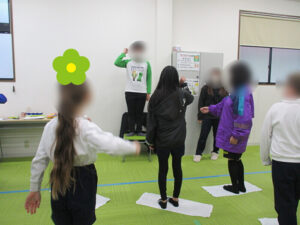 タオルを使っていくつかのバランスゲームをしました。始めに、タオルを下に敷いてジャンケンをして負けたら半分に折っていくゲームです。ジャンケンで負けると自分の敷地が狭くなっていくので「ジャンケン勝つぞ!」とやる気満々の子どもたちでした。だんだん敷地が狭くなってくると片足で立ってジャンケンをしないと行けなくてタオルからはみ出ないようにヒヤヒヤしながら立っていました。バランスを崩してタオルからはみ出てしまうととても悔しそうにしていました。
