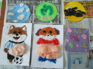 指導員が持っていた犬のお腹ぷにぷにシールが可愛くてその絵を描いてくれる子もいました。「お腹のぷにぷにのところをティッシュにすると固くなっちゃうよね?🙄」とお腹のところを綿にして工夫もしてくれました。
